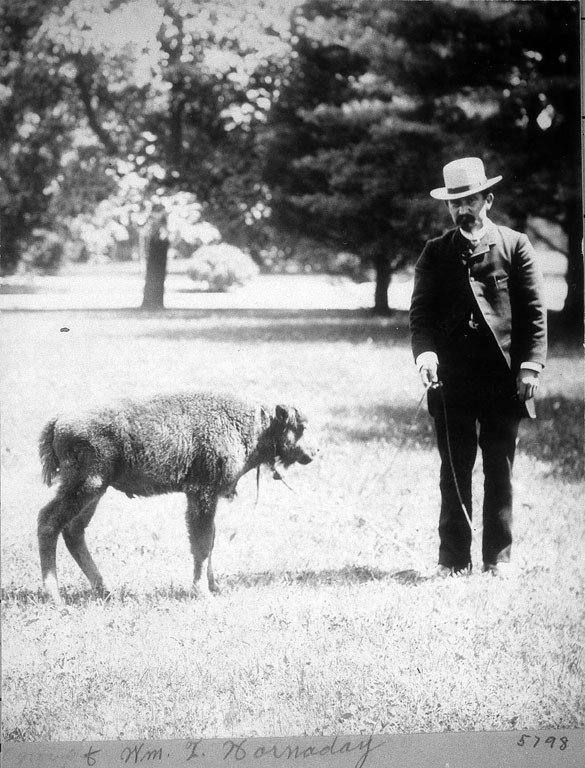 In an iconic image of the preeminent success of his life’s work, William Temple Hornaday is holding a leash and looking down lovingly at a newborn American bison (more commonly called the buffalo). We owe Hornaday a deep debt of gratitude for personally saving this symbol of the western American landscape from almost certain extinction.