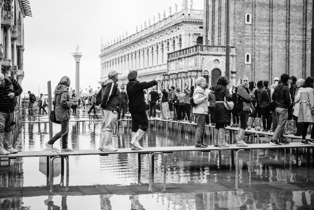Tourists avoiding sea-level rise in San Marco Square, Venice, Italy.