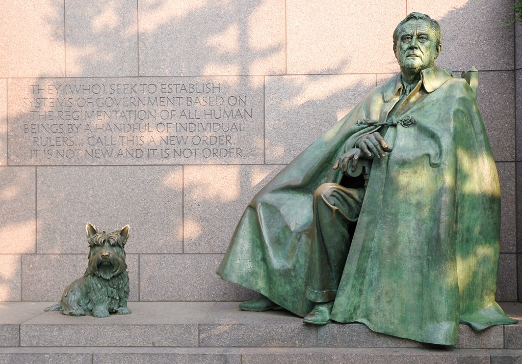 Bronze statue of a multi-faceted hero: President Franklin Delano Roosevelt (“FDR”) and his beloved dog, “Fala”.