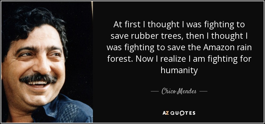 On December 22, 1988, a tragic event occurred deep in the Brazilian countryside that had a stark effect on worldwide natural resource conservation in general and today’s Climate Change situation in particular. On that day, Chico Mendes—a Brazilian rubber tapper, known as a seringueiro, and land rights leader—became world famous when he was gunned down outside his own home by the son of a local rancher. During the shooting, two Brazilian policemen—who were assigned to protect Mendes from death threats—sat playing cards at the kitchen table inside his home. Ironically, just the week before on his 44th birthday, Mendes had ominously predicted that he would not live to see Christmas Day.